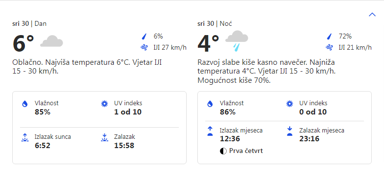 Poslednji novembarski dan će biti vetrovit, prohladan sa slabom kišom u večernjim satima. Jutarnja temperatira oko 4 a maksimalna dnevna do 6 stepeni.